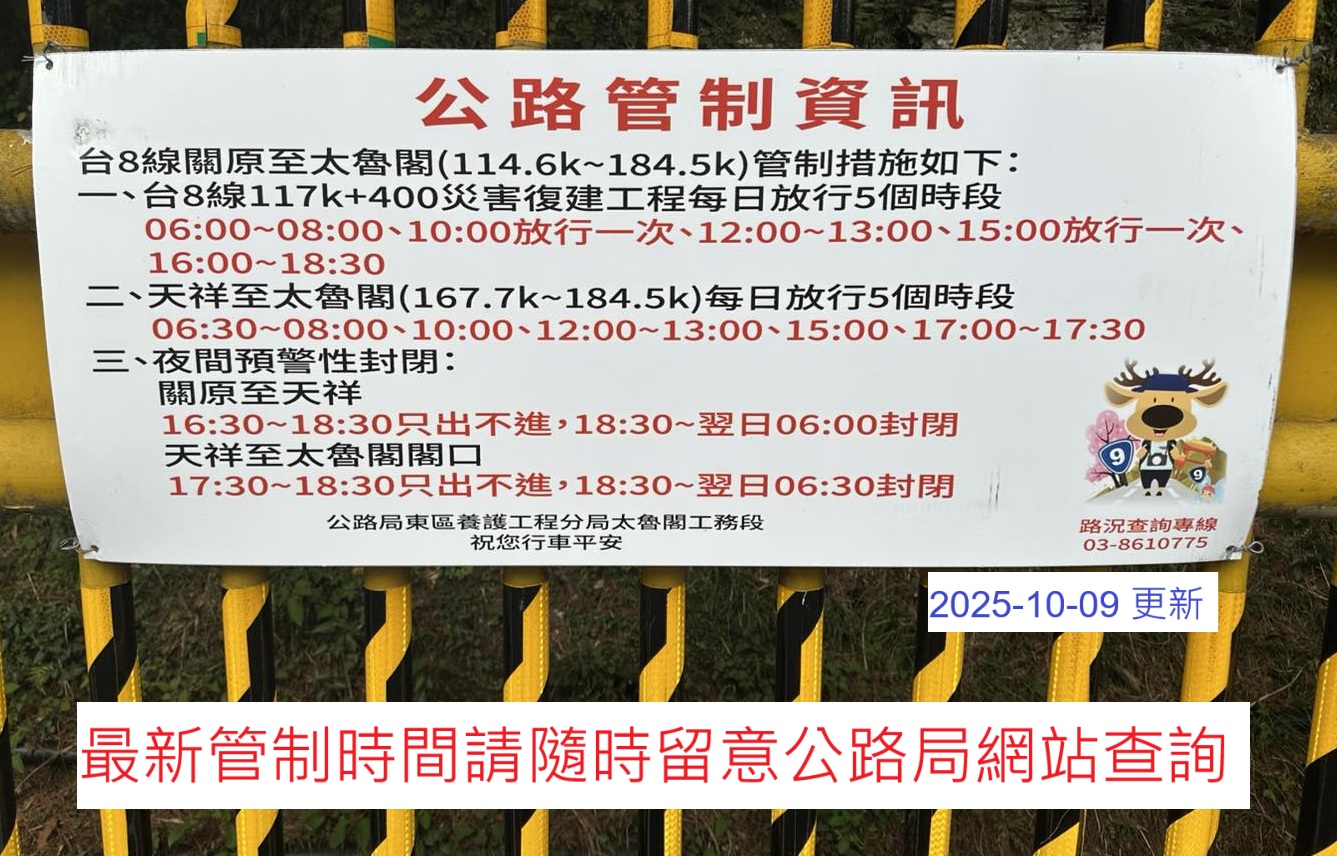 台8線 關原至太魯閣長期管制放行時間,夜間禁止通行。請至 {公路局} 網站確認通行時間。